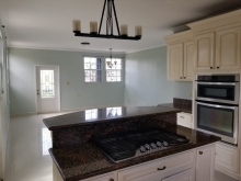 The apartment has 2 entrances, one from the kitchen and one from the living room. Each entrance has a small balcony space overlooking the yard space. Upon entrance of the living room one enters an open dining, kitchen and living room. The living room is large enough to fit a 3-piece sofa. The dining area can fit a 6-piece dining table. The kitchen is large and comprises of a breakfast bar island along with additional kitchen space. The kitchen comes equipped with a built-in stove, built-in oven, and a built-in microwave. At the end of the kitchen is a utility area for a stackable washer and dryer.