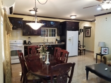 The apartment has an open concept kitchen living and dining room. The living room consists of a two piece sofa set with coffee table. The dining table is a solid wood 6 seater table. The kitchen is equipped with a fridge, electric stove, and mahogany cabinets with granite countertop. The apartment has a designated laundry room equipped with a washer, dryer and a washing tub. The bedrooms are furnished with a queen and a double bed with night stands.