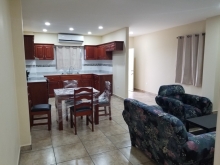 Spacious and quiet but in an ideal area of Ladyville! This 1 Bedroom apartment is excellent for anyone or even a company seeking an affordable place to stay. As you walk through the entrance you are greeted by a cozy open living, kitchen, and dining area. The living room features a small but comfortable sofa set with a coffee table, lamp and Small Flat screen tv for that much needed relaxation time. For those dinner nights, a beautiful wooden dining table that can seat four persons is provided. The kitchen Is equipped with a stainless-steel stove and hood vent. Plenty of counter and cabinet space. The entire living, kitchen and dinning area is well lit with recessed light fixtures, tiled throughout and air conditioned.