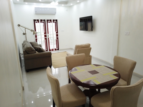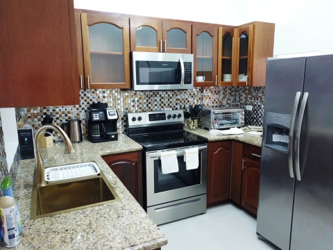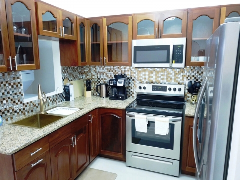 Upon walking through the entrance door, you step into a fully equipped kitchen with hardwood cabinets, backsplash, granite counter-tops and all new appliances. Right after there is the open dining and living room area of the apartment that has a 4-seater dining table, a 3-seater sofa, recliner chair, and mounted flat screen Tv. Past the living room there are French doors that leads to a small veranda. Behind the kitchen there is the laundry room where a washer and dryer are located.