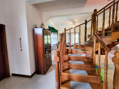 A fully equipped kitchen with recently installed hardwood granite kitchen counters, ample cabinets, locally sourced mahogany staircase and ceilings.
