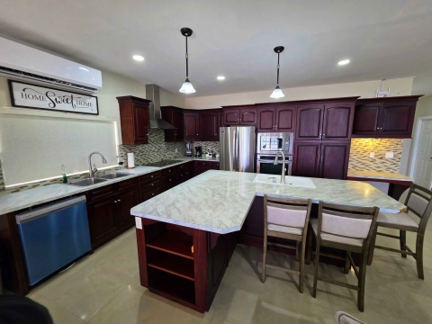 The interior features tasteful modern décor, a spacious living area, and a well equipped kitchen with stainless steel appliances, rich wood cabinetry, and a sleek marble island. The dining area comfortably seats eight, making it perfect for family dining and seating guests.