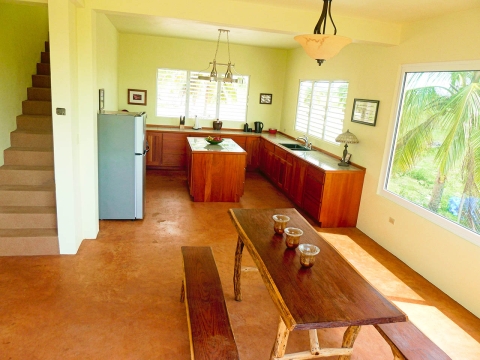 The guest bedroom downstairs has wonderful views of the Bay and a bathroom next to it. The master bedroom upstairs has an en-suite bathroom with an additional walk-in wardrobe. In the master suite, there are additional closets with mirrored doors from floor to ceiling. The room has amazing views across the Bay towards Sarteneja. Upstairs there is the Great Room with magnificent views of the Bay and the surrounding jungle. There is a formal dining area and a large lounge area. Downstairs is a large open entrance hall leading to an open-plan lounge, dining area, and kitchen. The kitchen consists of solid mahogany cabinets with granite tiled surfaces. The kitchen has brand-name appliances included in the house's sale. There is a black composite sink with high-end quality fittings.