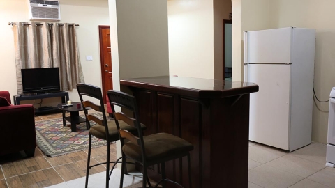 The house has 2 spacious bedrooms that have newly built closet spaces. These two bedrooms share one main bathroom that is fully equipped. The bathroom has access to hot and cold water. The main living area is open-planned with kitchen, living, and dining areas—all elegantly decorated with cozy and comfortable furnishings. There is also a small room designated for laundry. The entire house is fully tiled and there is a heavy-duty air conditioning unit that provides cool air to the entire house.
