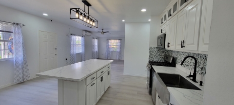 At the heart of the home is an open-concept living, dining, and kitchen area designed for effortless entertaining and everyday living. The kitchen is a chef’s dream, outfitted with modern stainless steel appliances, including a refrigerator, gas stove, and over-the-counter microwave. It also showcases granite countertops and an abundance of elegant mahogany cabinets, providing ample storage for all your culinary needs.