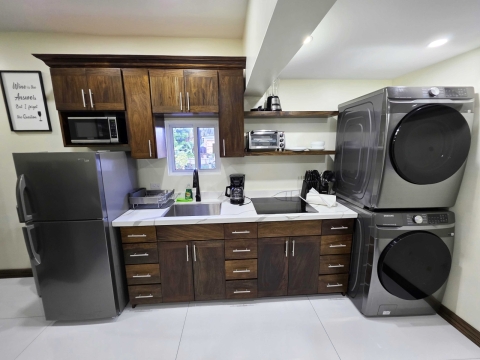 This open layout studio features a kitchen and living area, providing a comfortable setup for daily living. The kitchen comes equipped with a refrigerator, electric stove, microwave, toaster oven, and kitchen utensils.