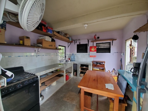 An elevated 2-story wooden building that is paneled with hardwood floors, walls, and ceiling; has 6 beds, 2 baths, a 20'x30' wooden deck on the first floor; a 20'x30' open room with a double French door that opens into a 10x20' veranda with sea view on the second floor, in the property is also a concrete structure designed for outdoor kitchen, an outdoor fire heart (grill) and 12x20' shed structure, a well for groundwater supply, completely fenced in 6' tall concrete, 2 mature flowering trees, photos, You can rent the upper floor and live on the ground floor so this is an income earning property. Enjoy the tropical breeze and the view of the beautiful blue sea.