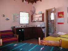 The casita is 12'x12' with tiled floors, sleeping loft, "lock-up" storage, efficiency kitchen with under counter refrigerator, gas stovetop, microwave, miscellaneous appliances, tiled counter, stainless sink, shelves, toilet room with small clothes washer, 4'x5' concrete and glass block shower.