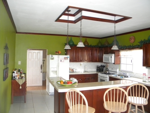 This 4 bedroom, 2 ½ bathroom concrete home measures approximately 4,000+ sq. ft. and is built to U.S. standards. Each bedroom has its own AC unit and closet. The master bedroom has its own private bathroom, and walk-in closet. The house has the entrance hallway, living room, dining room, and kitchen in an open layout. An office/computer room with a glass partition adjoins the entrance hall, dining room, and kitchen. The dining room has a lovely wooden dining set and the kitchen has tiled countertops and mahogany cabinets.