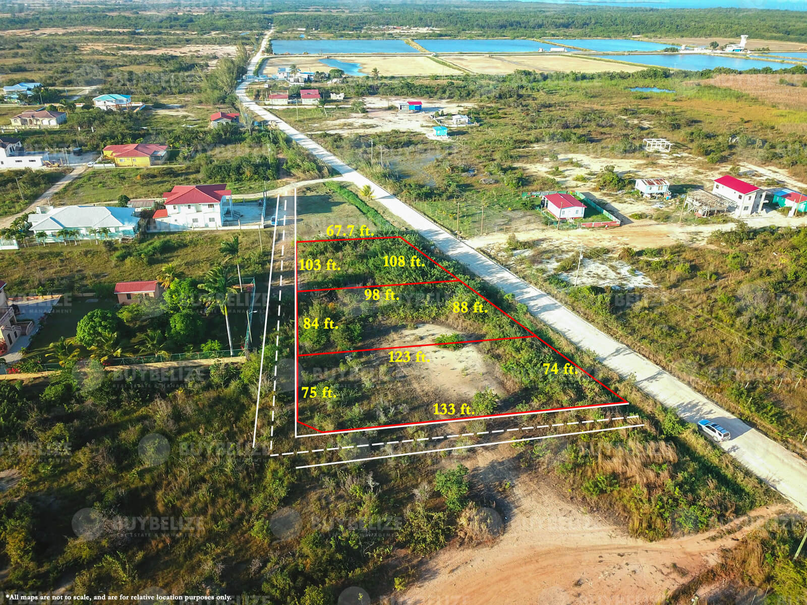 The property is measured at approximately 9,379 sq. ft. and has 172 ft of road frontage because it can be accessed from two different streets. The land is located in a high and dry area of Ladyville and does not require much landfill, but it has been cleared of its original vegetation. There is also access to all utilities. Directly next to this property, there are also two more properties are available for sale. Each lot is priced to sell at $30,000 USD.