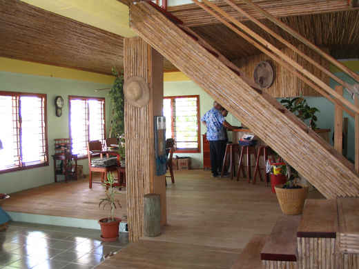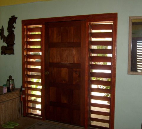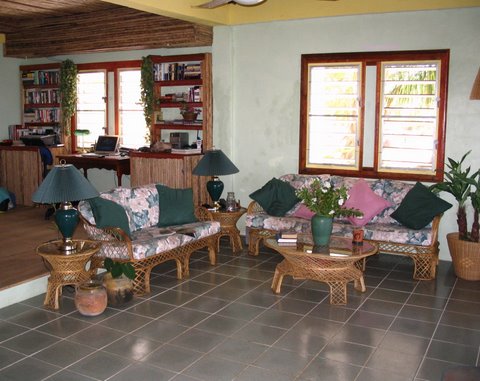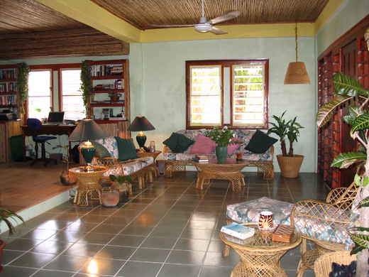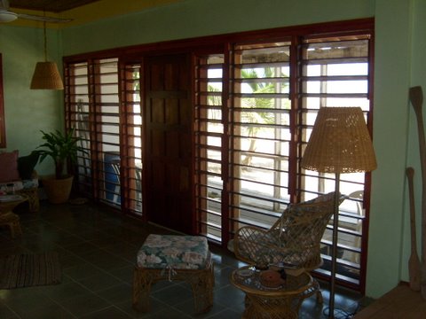 You walk into the house through the front door which has a small rain porch, and you are immediately in our open plan living area. The entrance area is our office, with mahogany built in shelves and a tropical wood floor. To your right are open mahogany stairs leading to the upper floor. Beyond the office area is our sunken sitting area, which is tiled, and has views of the sea and the garden. A door leads out to our deck, which is about 10 yards from the Caribbean. Along the whole wall facing the sea and the walls at each end of the room we have mahogany louvered windows, letting in both light and breeze.