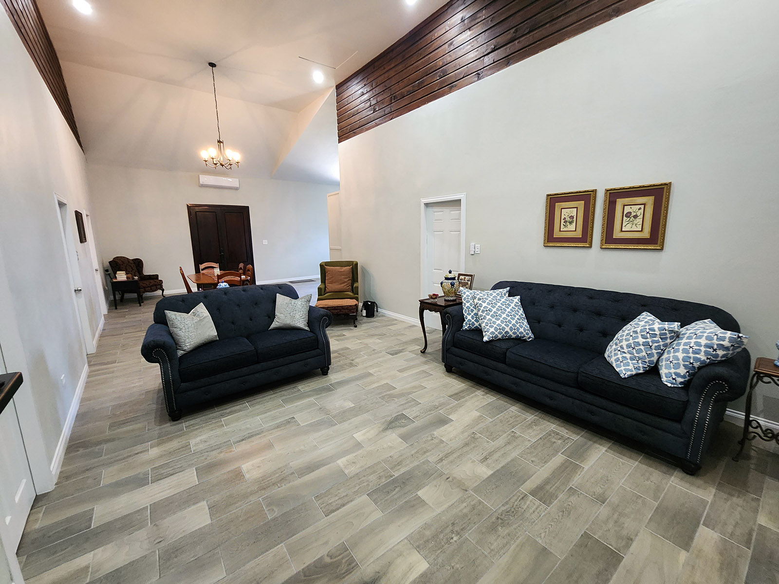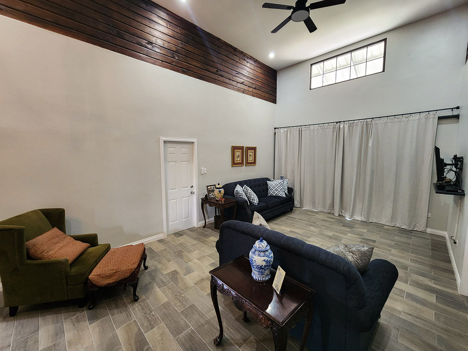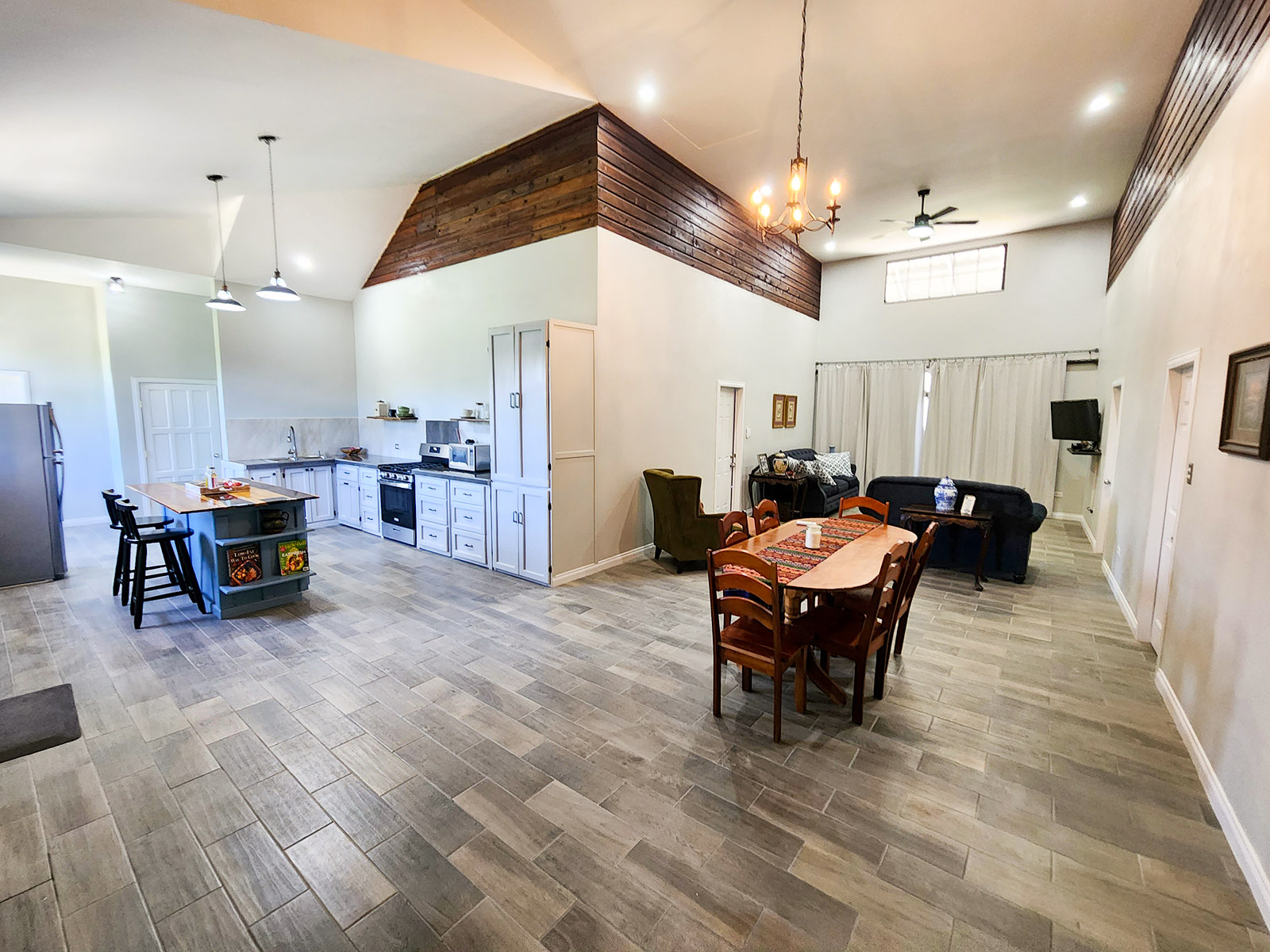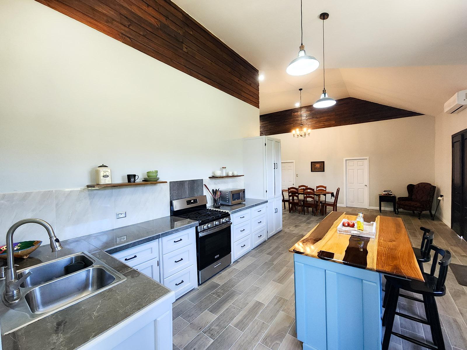 This beautiful property has a lovely modern home that consists of three large bedrooms and has 2.5 bathrooms. As you enter this luxurious home you encounter the open-concept kitchen, living, and dining area. Not to mention, the house has the perfect kitchen island where you can prep all the delicacies and meals in this vibrant kitchen. The kitchen is equipped with stainless steel appliances including a microwave, stove, and refrigerator, and has all wooden cabinets and granite and wooden countertops. As you turn to the right, you come across the dining area comprising a six-seater dining table.