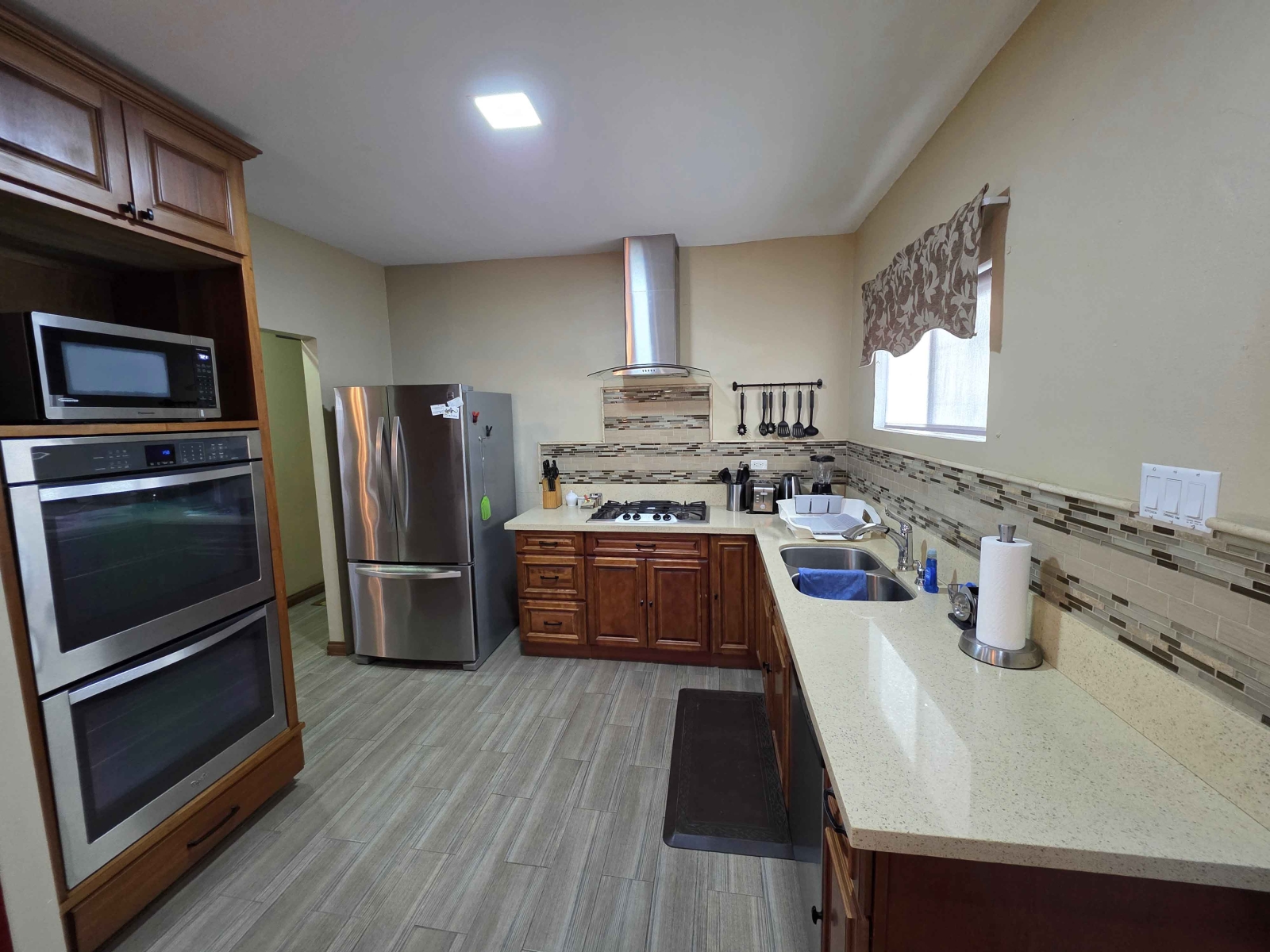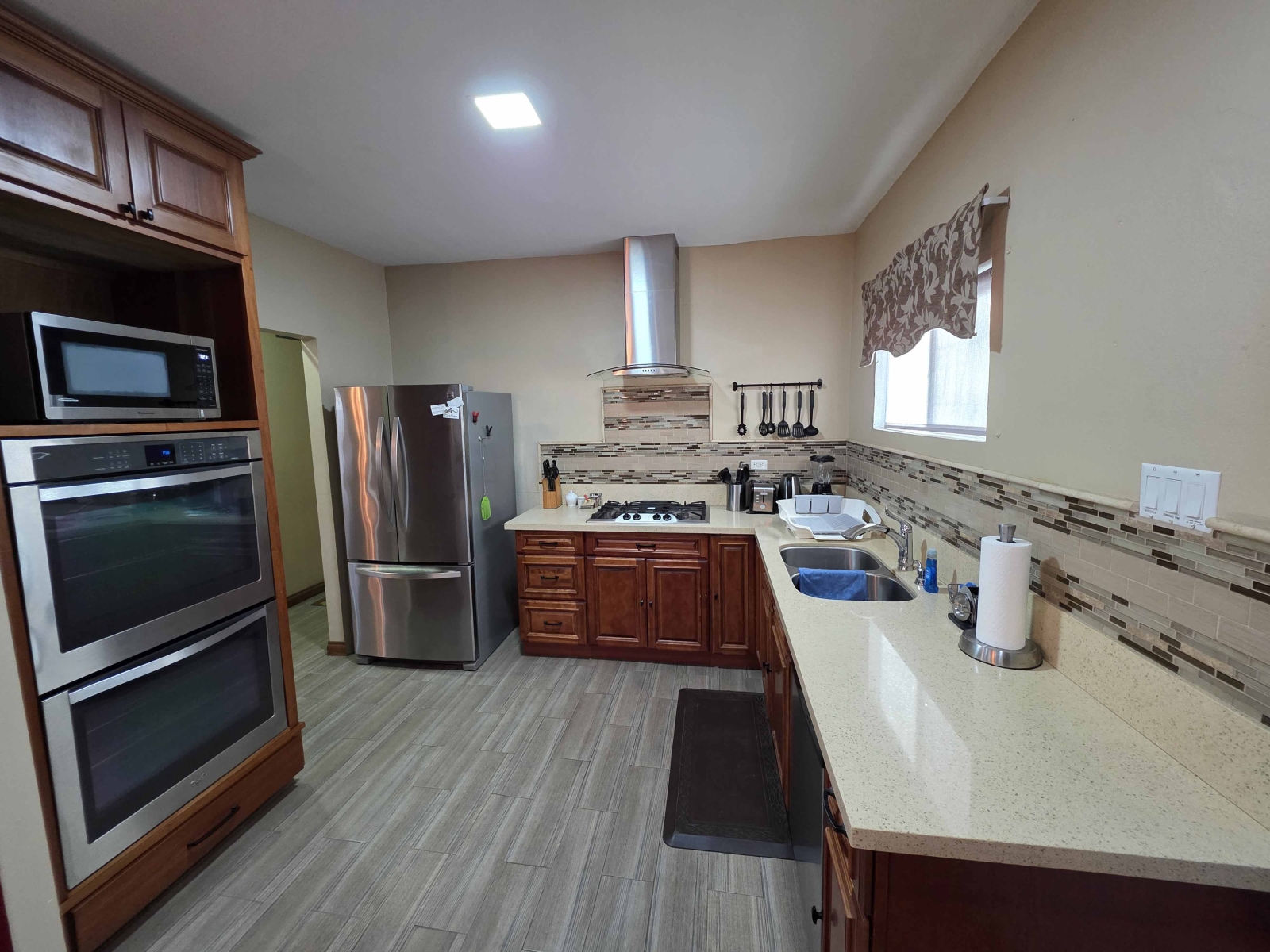 The kitchen boast of a lot of counter space and has a quartz finished top. The kitchen is fully equipped kitchen with a built in stove, built in oven, double door fridge, microwave, blender, coffee maker, pots, pans, plates, cups and utensils.