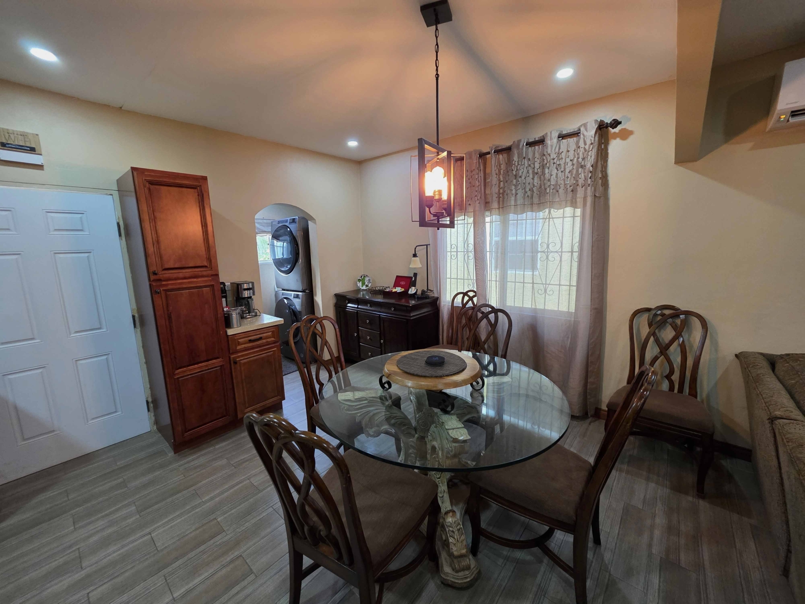 The kitchen, dining and living room was recently remodelled to acquire a modern feeling. The living room consist of a 3 seater couch, 2 single couch and 2 single chairs. The living room consist of a 49 inch flat screen T.V. The dining room consist a glass dining table to seat up to 6 persons. In the dining area consist of a small laundry room consisting of a Washer and Dryer.