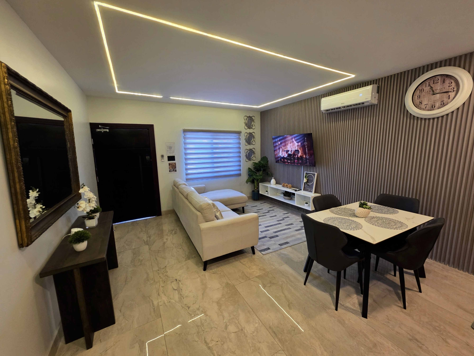In addition, the apartment also has an air conditioner and is furnished. This gorgeous apartment has an open-concept, kitchen, living, and dining area. The kitchen includes a microwave, stove, and refrigerator and all rooms are fully tiled. The dining room includes a four-seater dining table, and the living room includes a couch. The laundry room is equipped with a dryer and washer. Located in a safe and secure neighborhood and conveniently located near stores, supermarkets, pharmacies, schools, and other agencies.