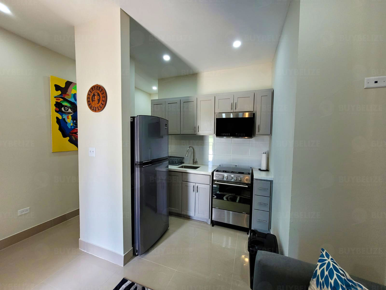 The kitchen has all stainless-steel appliances equipped with a refrigerator, microwave, and stove. As you move to the right and walk forward you will encounter a lovely modern one-bedroom that has a king-sized bed equipped with a television, drawers, and air conditioning. All rooms are fully tiled and have ceiling fans in the apartment.
