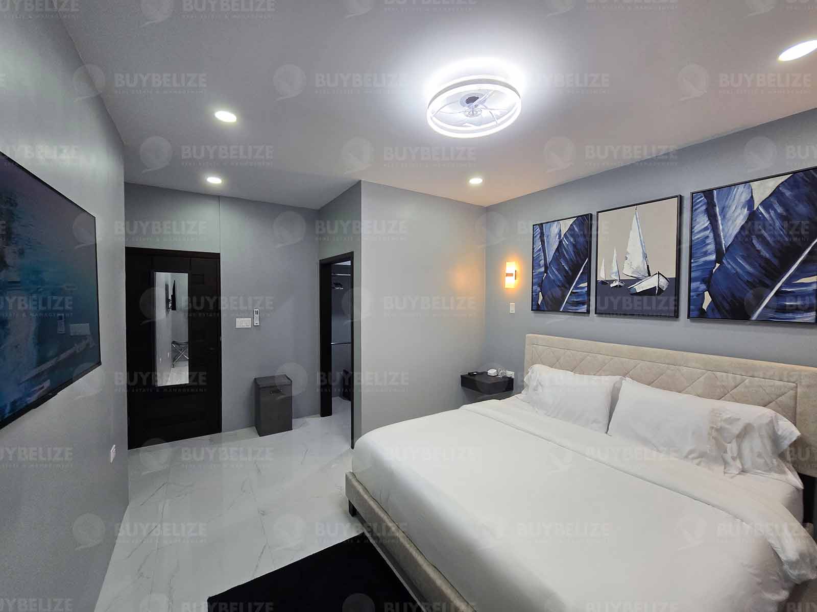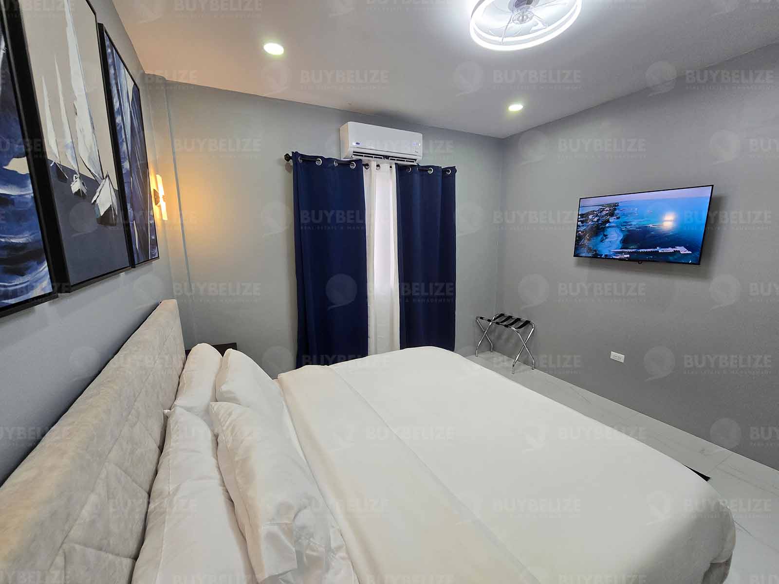 Retreat to the spacious bedroom, where you will find a plush king-sized bed that promises restful nights. The bedroom also includes a stylish dresser, a flat-screen television, and a spacious closet, offering plenty of room to organize and store your personal items with ease. This apartment combines comfort and functionality, making it the perfect home for anyone looking to experience a vibrant lifestyle in Belize City.