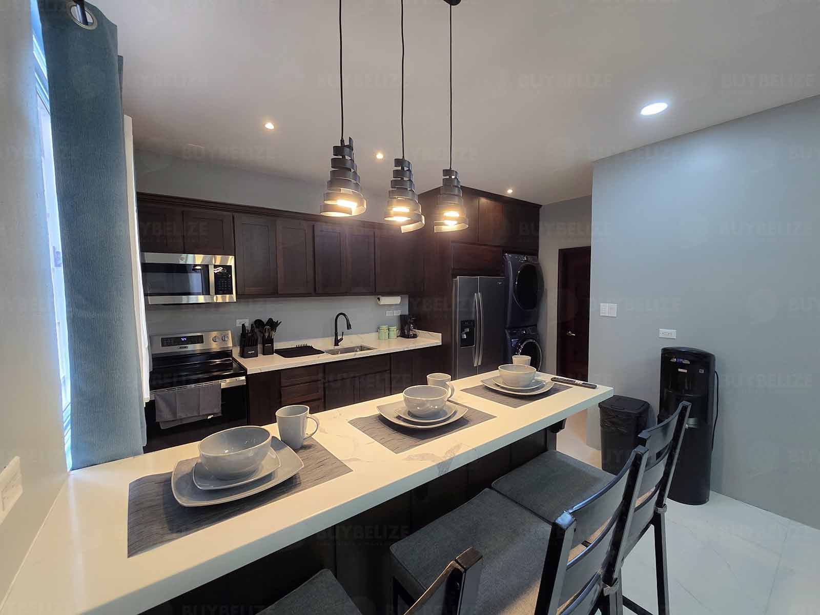 The kitchen is a chef’s dream, featuring elegant mahogany cabinets that provide ample storage. It is equipped with modern appliances, including a refrigerator, stove, microwave, and other essential kitchen appliances, ensuring you have everything you need for your meal prep. For added convenience, a washer and dryer are located to the right of the kitchen, allowing for effortless laundry days.