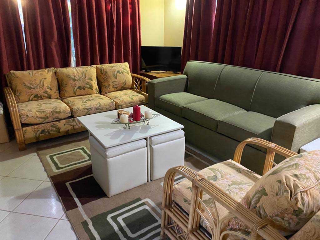 The dining area is thoughtfully furnished with a four-seater dining table, creating a perfect space for enjoying meals with family and friends. Adjacent to the dining area, the living space is adorned with a comfortable 2-piece couch set, providing a cozy spot to unwind after a long day.