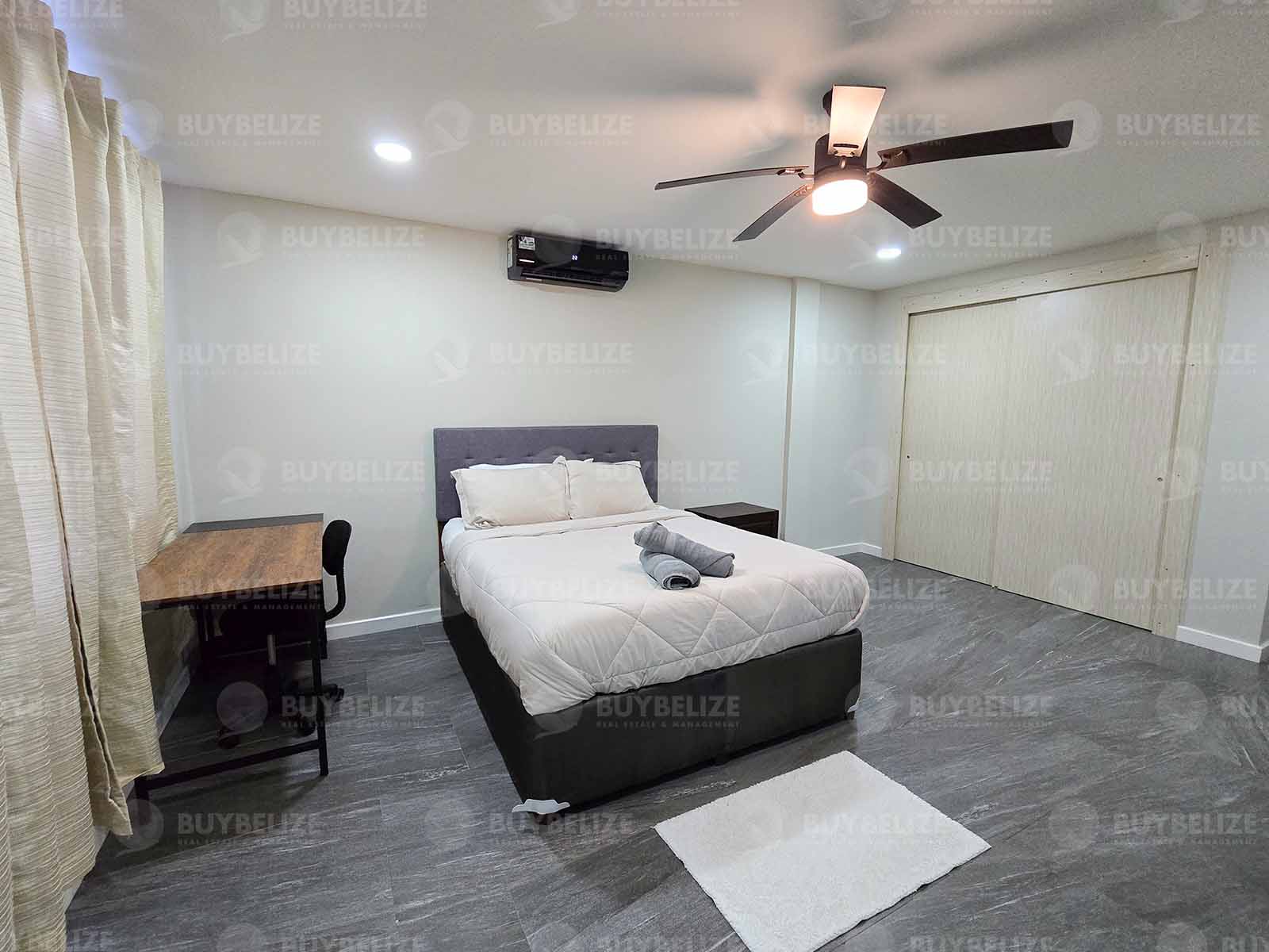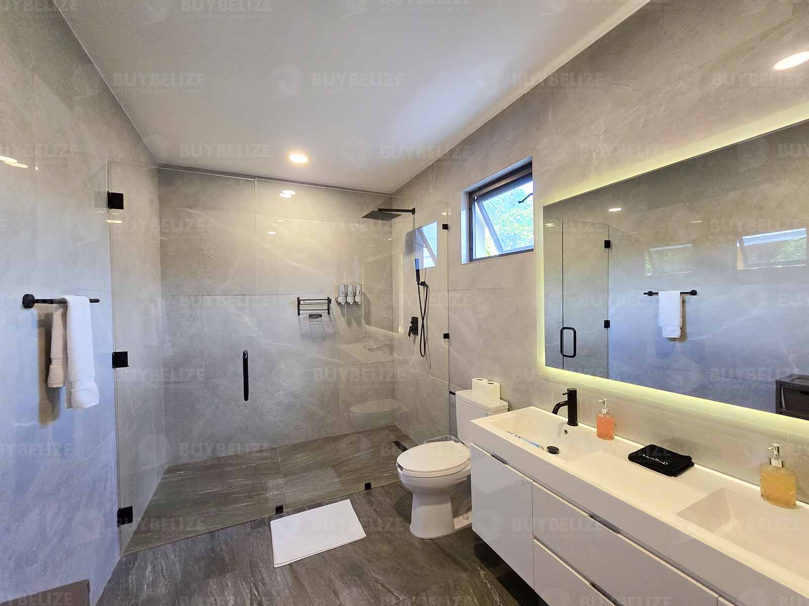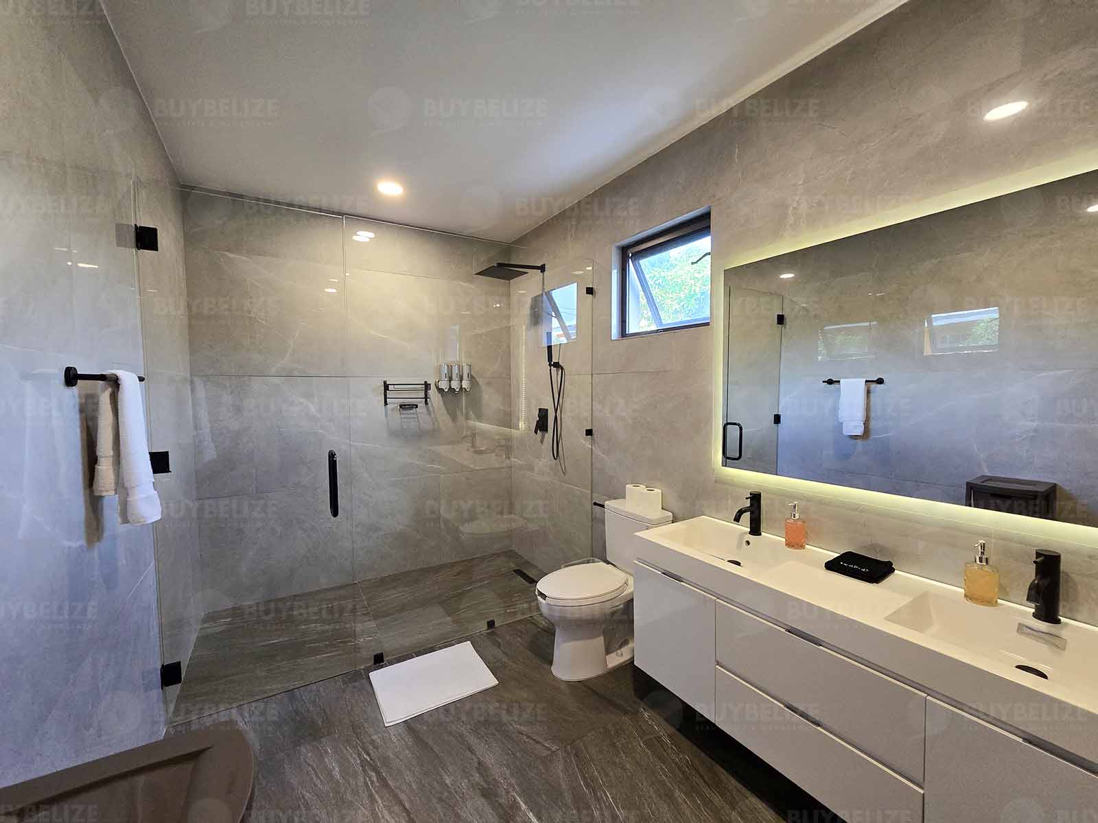 The quest room fits a queen or even a double comfortably. Both bathrooms consist of walk-in showers and his and hers vanities.