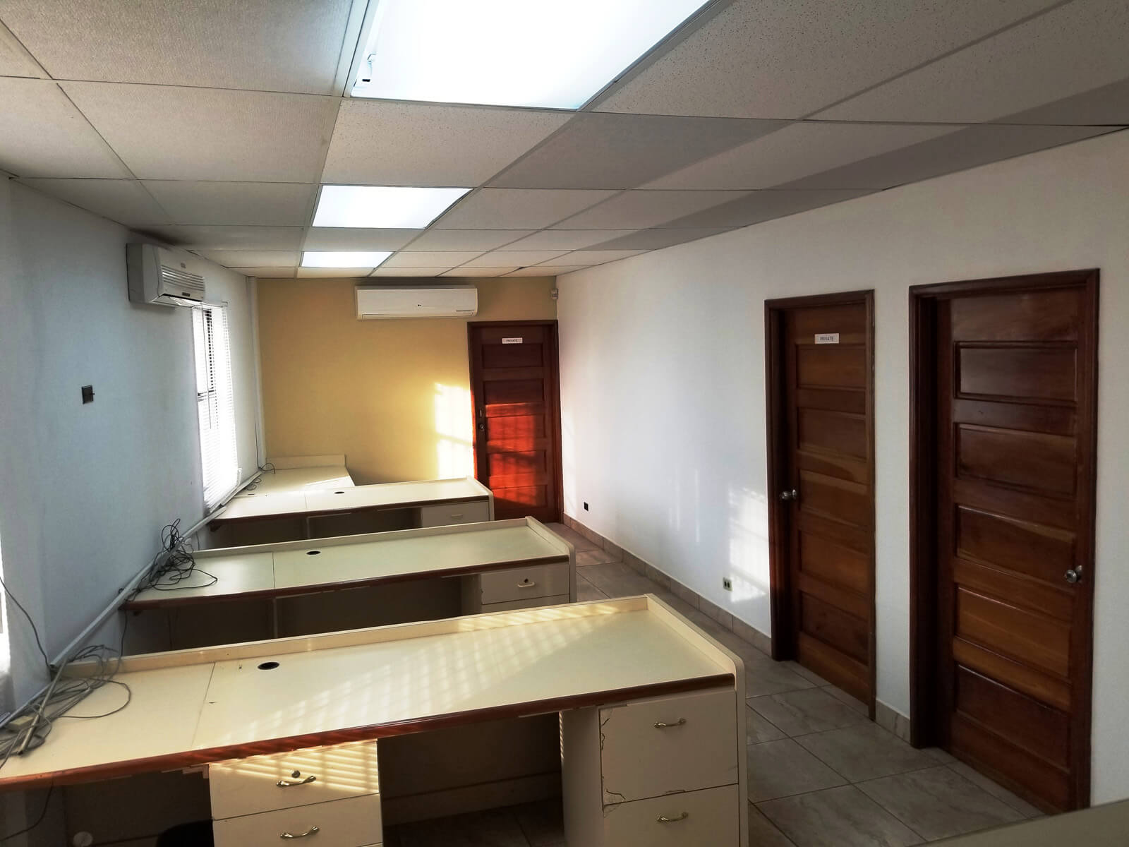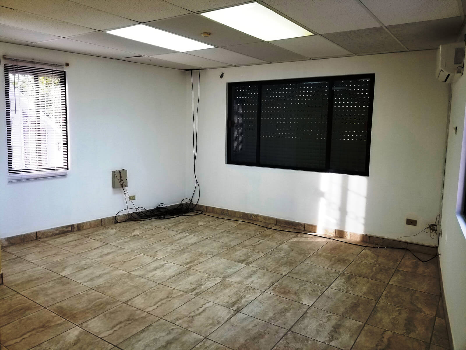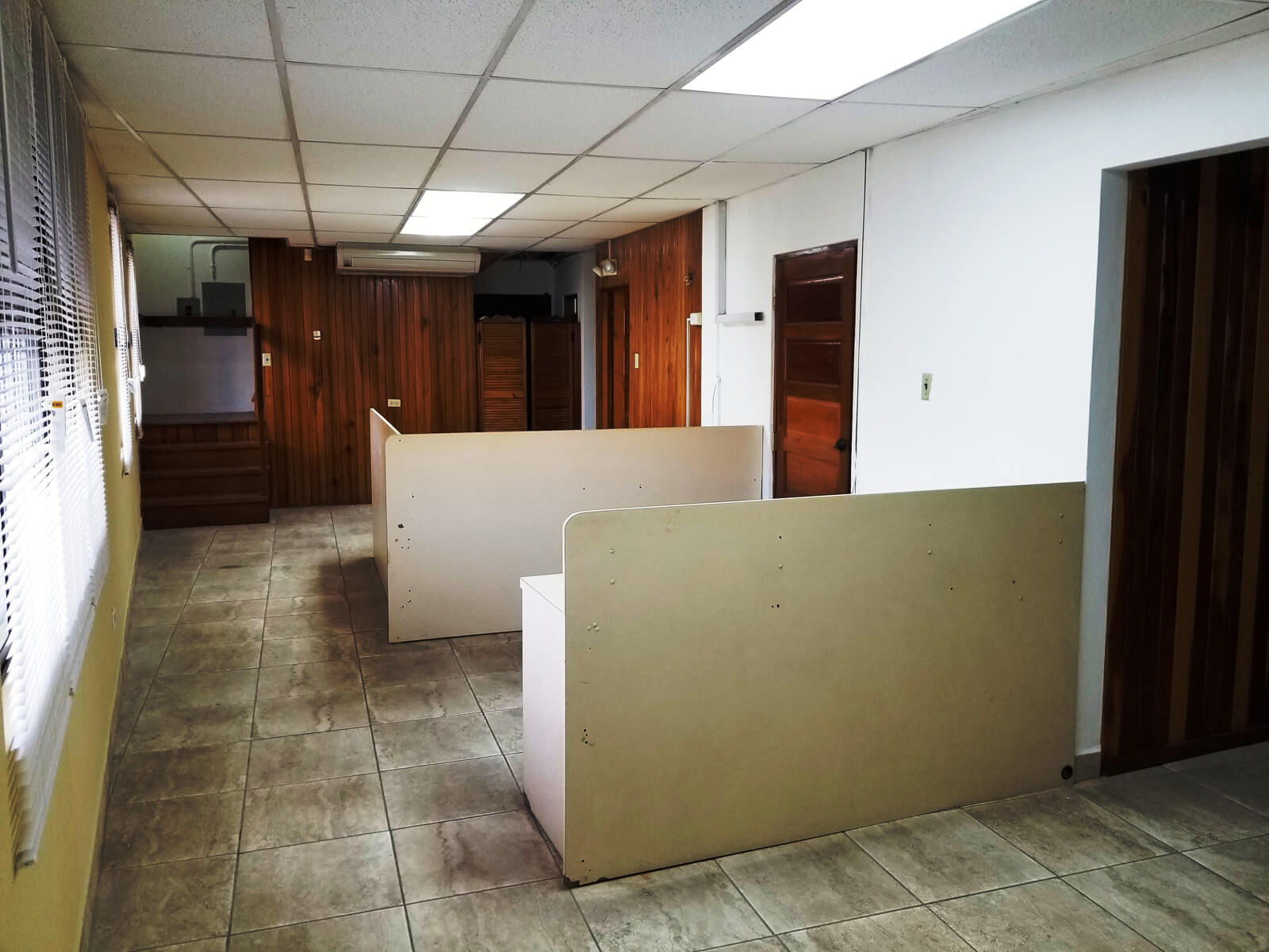 When entering the building on the ground floor there is a large open space that is tiled and has two A/C and can sever as a lobby or cubicles can be installed. On the same ground floor there is another large space that is separated by a wall with two glass doors. This space also has A/C and access to a restroom. Under the stairs that leads to the 1st floor there a small storage room.