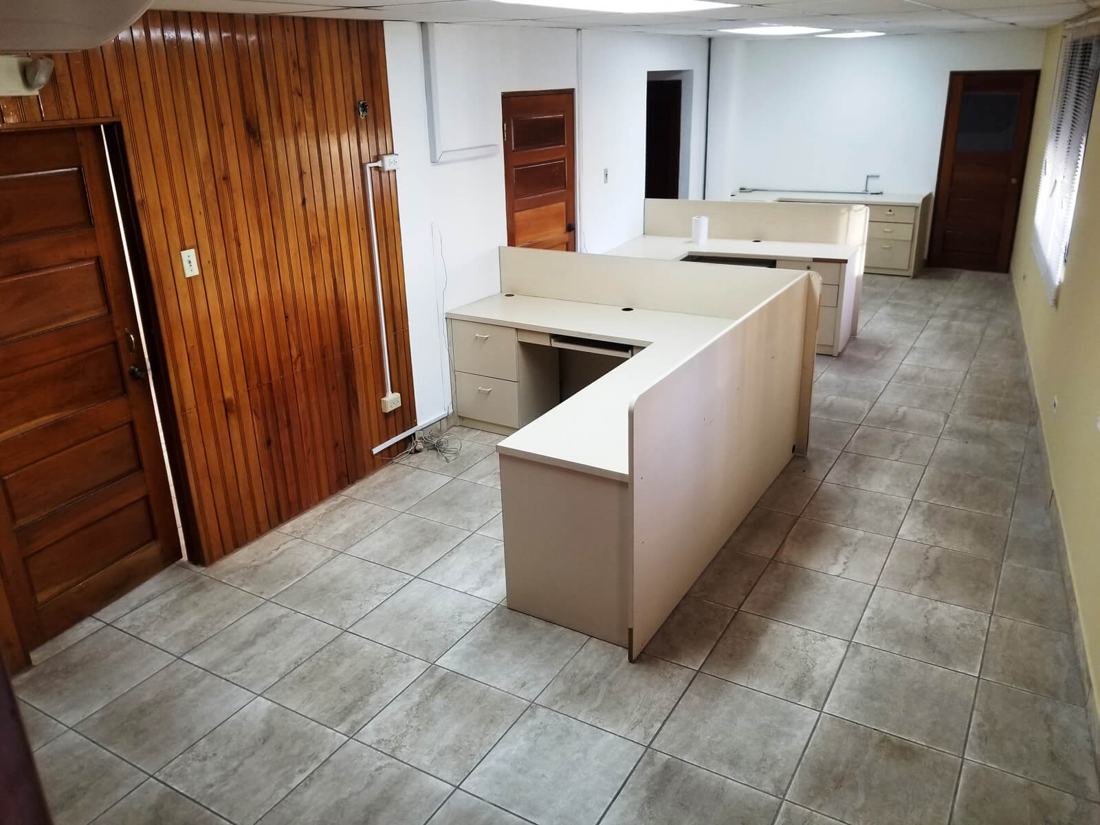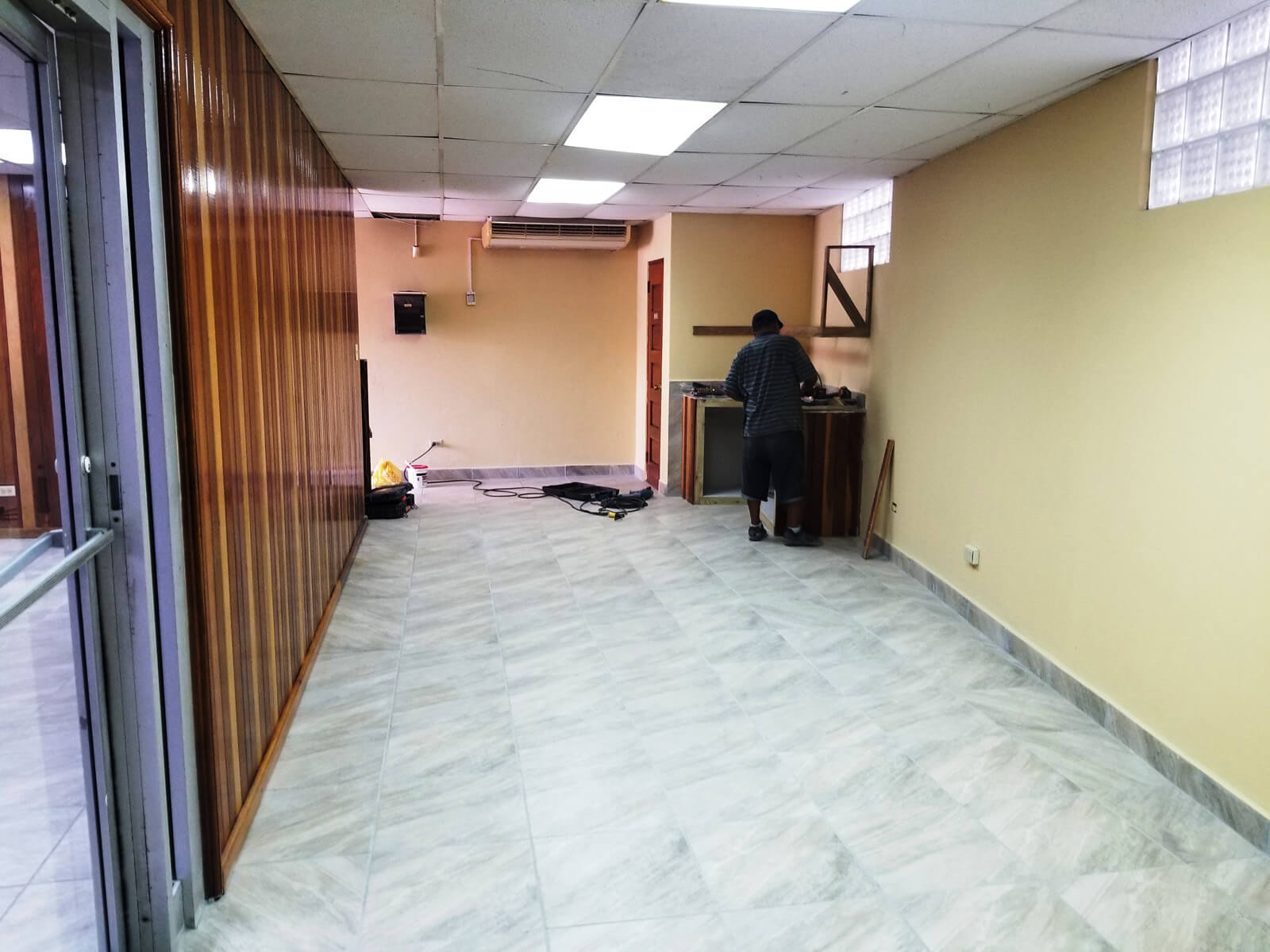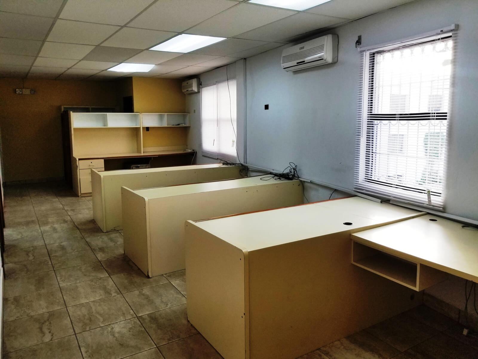 When entering the building on the ground floor there is a large open space that is tiled and has two A/C and can sever as a lobby or cubicles can be installed. On the same ground floor there is another large space that is separated by a wall with two glass doors. This space also has A/C and access to a restroom. Under the stairs that leads to the 1st floor there a small storage room.