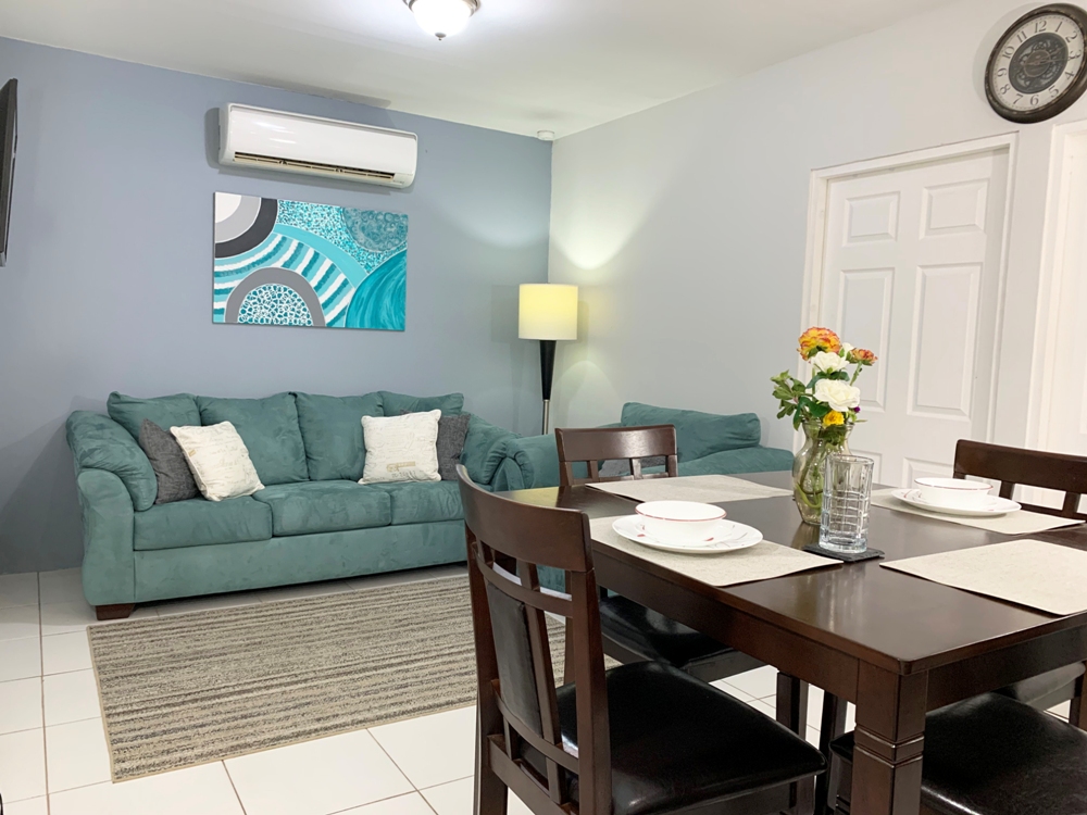 This beautiful apartment is very modern stylized and equipped with chrome, new appliances and beautiful, fashionable furniture. The apartment offers approximately 1,800 sq. ft. of living space making it quite a spacious apartment. The master bedroom is very large and can comfortably fit a king sized bed. The master bedroom also has access to its own private bathroom. The apartment has access to a large front balcony with stunning views of the Caribbean Sea horizon and the surrounding neighbourhood. The entire apartment has central air system.