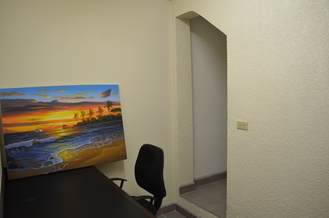 One enters into a waiting area. Behind the waiting area is a reception area with storage. The downstairs also consist of an office, 2 work station, bathroom and kitchenette. At the very back of the office is an open room consisting of 800 sq ft of space wired for more workstation beautifully designed with multiple sliding glasses looking at the parking space.
