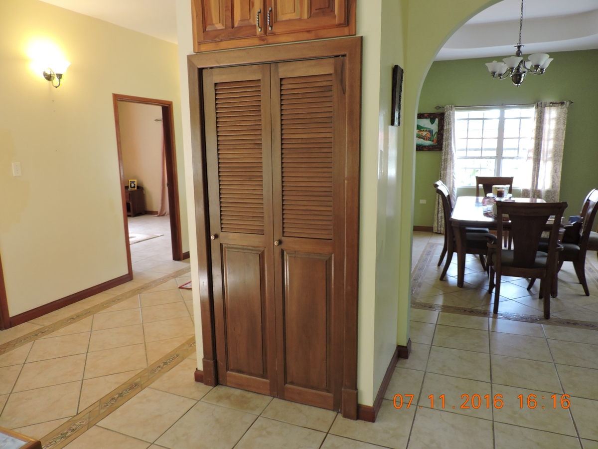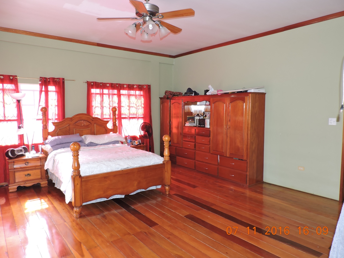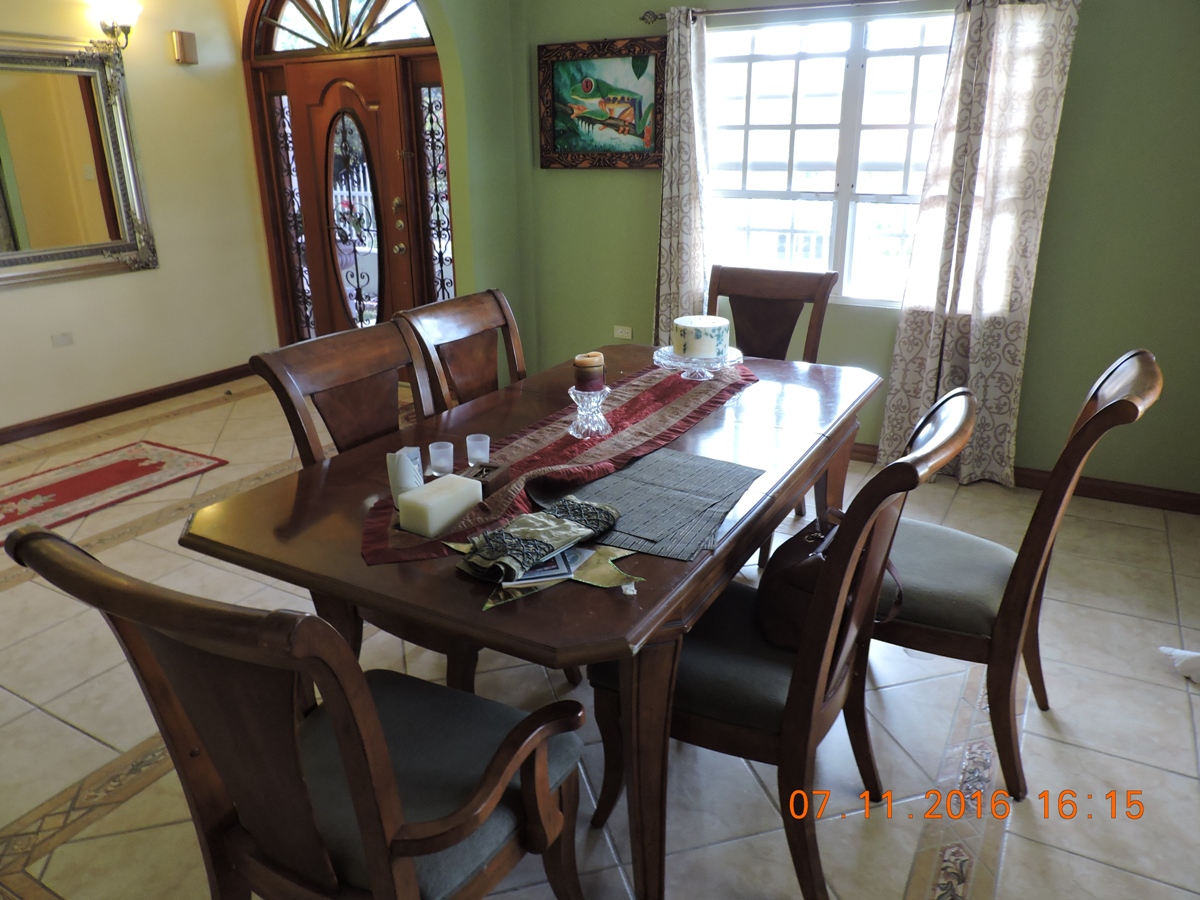 This is a beautiful, semi-furnished, two-story concrete building that is situated on a double lot within the Piccini neighborhood. It measures 4,200 square feet along with an upper floor that has a polished wooden floor and a concrete bottom floor. It has a dining room, living room, and an open space kitchen. There are a total of 5 bedrooms, four are located on the upper floor and the guest bedroom is located in the lower floor. It also contains a laundry room and a storage room. It is fully fenced and has burglar bars. It has a wooden staircase that grants access to the upper flat. The yard is beautifully landscaped and spacious and measures 150 ft street frontage by 90 feet in depth. The house also has hot and cold water that runs on solar power. Whenever the power is down the solar energy will serve as an alternate source of electricity that will provide power only to the master bedroom area on the upper flat along with providing power to all utilities in the lower flat except the refrigerator.