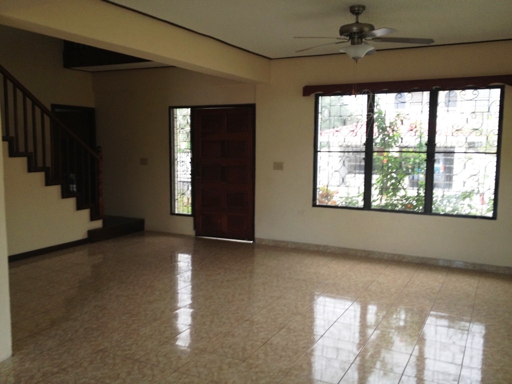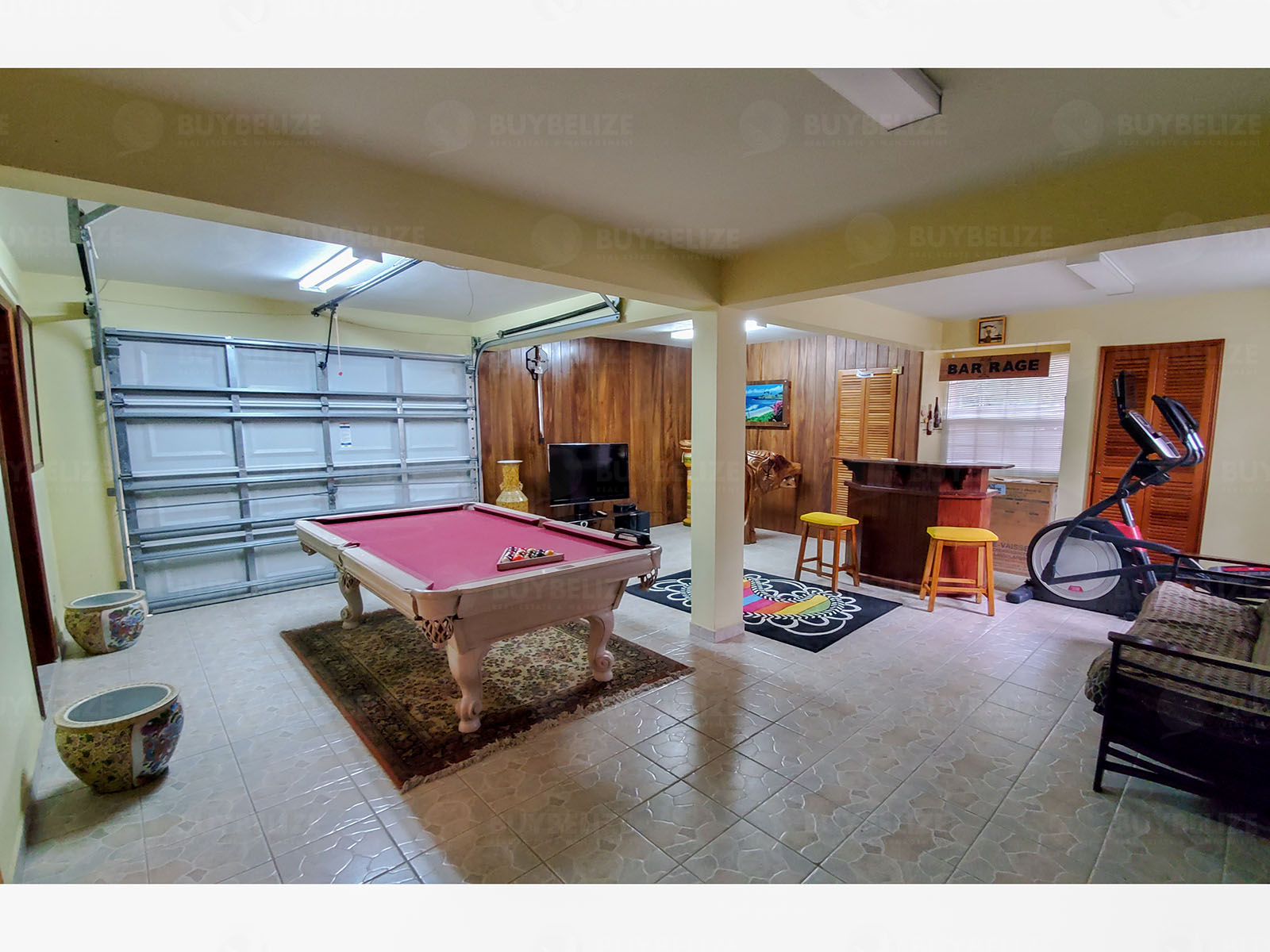 Up the staircase to the first floor is where the bedrooms are, but first to your right there is a small den overlooking the living space with a clear view of the outside. The master bedroom has a queen size bed, night stands, ceiling fan and air conditioning. The master bedroom has a walk-in closet and a master bathroom. The master bathroom has a vanity sink with a jacuzzi tub and a standing shower. The main feature of the master bedroom is the large balcony that you can easily access and have a bird’s eye view of the entire property and neighbourhood. The house also has two guest bedrooms that can fit a queen size bed and other furniture. Both bedrooms have air conditioning and access to a shared full bath. There is also a dedicated laundry room that is equipped with a washer and dryer mop sink. There is also a full car garage that is currently being used as a game room or den.