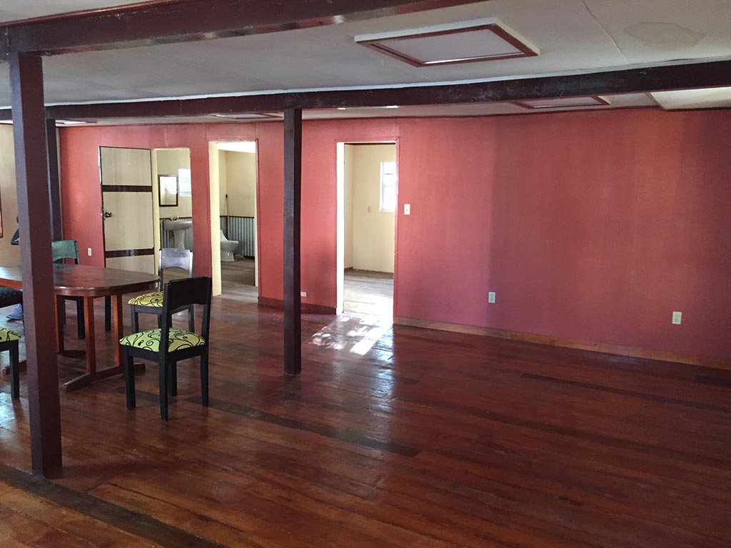 This office space is a two story house that has been repurposed as a commercial unit. The first floor is currently available for rent and comes with an open area that is quite large and can house cubicles and/or desks. The floor also has a fully-equipped bathroom that is quite large. Just off the main open area is a kitchenette; it has sufficient space to hold a table.