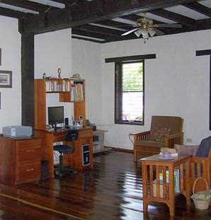 The house has white stucco inside and out with dark beamed ceilings and mixed hard word floors.