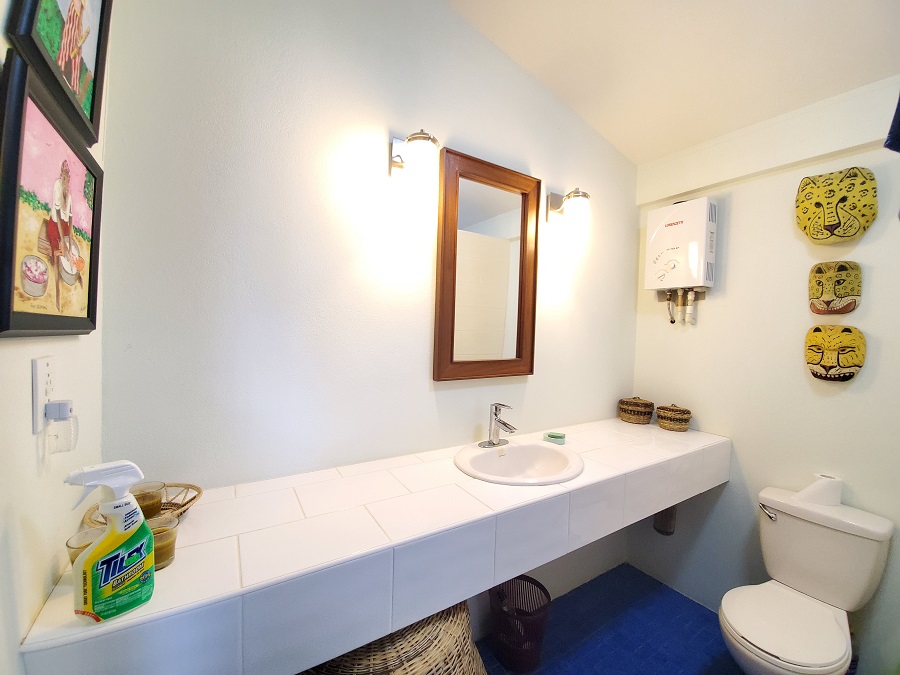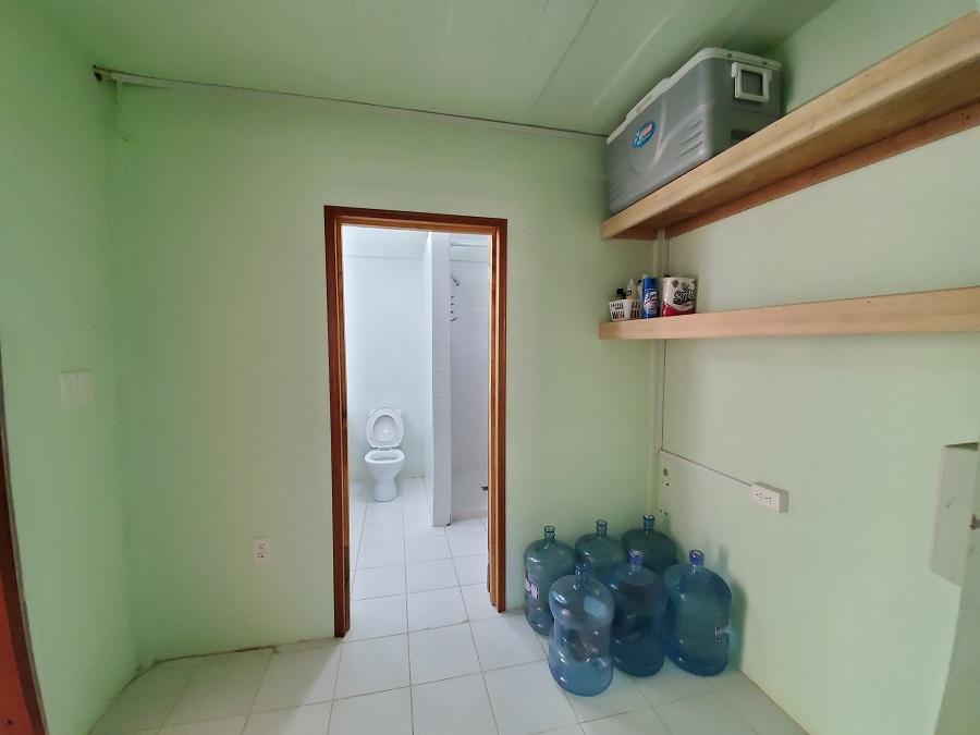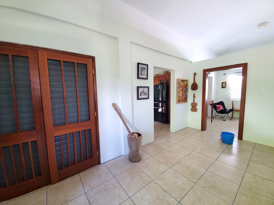 The ground-floor apartment includes a spacious bedroom, a kitchen adorned with stunning local mahogany cabinets, and a generously sized bathroom. Both levels have their own verandahs, offering additional space to relax, meditate, and enjoy the peaceful natural surroundings. The upper floor also boasts a beautiful wraparound verandah, perfect for taking in the scenery.